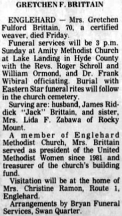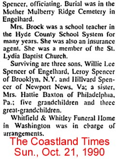 ENGELHARD, N.C. - Dorothy BURNETTE, 74, died Oct. 31, 1991, in a hospital. Mrs. Burnette was born in Engelhard, N.C., where she was a member of Mount Pilgrim Disciples Church. Survivors include two sisters: Etta Gibbs and Louise Coleman, both of New York City, and a brother, Dennis Gibbs of Elizabeth City. The funeral will be conducted at 2 p.m. today in Mount Pilgrim Disciples Church by the Rev. John Bryant. Burial will be in Brown Memorial Cemetery in Engelhard. Rowsom Funeral Home, Columbia, N.C., is handling arrangements. (The Virginian-Pilot - Tuesday, November 5, 1991; pg. 2D)
