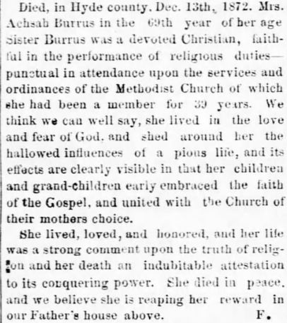 FAIRFIELD - James (Tom) H. Burrus, 72, died Sunday, August 23. A funeral service was set for Saturday, August 29 at 2 p.m. at Star of Zion Disciples Church of Christ in Fairfield. Rowsom Funeral Home, Columbia, was in charge of arrangements. (The Coastland Times [Manteo, NC] - Sunday, August 30, 2009; pg. 8A)