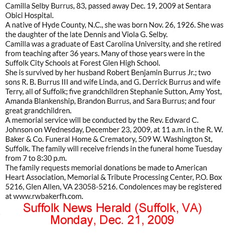 Bobby Hughes Burrus, 75, of 23040 U.S. Highway 264, Swan Quarter, died Monday, January 7, 2013, at Vidant Beaufort Hospital, Washington. Born in Dare County, November 10, 1937, he was the son of the late Robert E. and Lula Mae Twiford Burrus. Bobby spent most of his working years in the automobile industry at McCoy’s Body Shop. Funeral services will be held Wednesday at 2 p.m. at the family plot at Soule Cemetery. Rev. Jerald Craddock will officiate. Surviving are a brother, Allen E. Burrus of Swan Quarter and a sister Carolyn B. O’Neal of Swan Quarter. He was preceded in death by two brothers Johnny Burrus, Robert Burrus and a sister Willie Estelle Burrus. The family will receive friends immediately following the service. Arrangements are by Bryan Funeral Service, Swan Quarter. Washington Daily News - Wednesday, January 9, 2013)