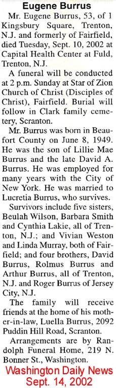 ELIZABETH CITY, N.C. - Enoch Lee BURRUS, 68, of Elizabeth City, N.C., died at Albemarle Hospital Wednesday June 6,2001. A funeral service will be held at Corner Stone Missionary Baptist Church Monday at 1 p.m.. Burial will be in Oak Grove Cemetery. Visitation will be at Walson Funeral Home Sunday from 5 p.m. to 9 p.m.. The family will be at the home of his sister, Mrs. Edna B. Riddick. Mr. Burrus was an employee of the City of Elizabeth City and the son of the late James and Emily Harris Burrus. Survivors include three sisters: Edna B. Riddick of Elizabeth City, Agnes Cooper of Norfolk, Va. and Sandra Gaylord of Virginia Beach, Va.; four brothers: Marshall Burrus, Franklin Burrus, Delmonte Burrus and Ray Burrus all of Spring Valley , N.Y. (The Daily Advance - Saturday, June 9, 2001) [Kindly submitted by Pat Richard]