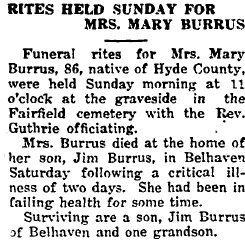 FAIRFIELD - Dorothy Virginia BURRUS, 77, of Hyde County, died August 11, in Pungo District Hospital in Belhaven. Mrs. Burrus was a member of the Snow Hill Baptist Church in Fairfield. She is survived by four daughters: Lodia Allen Burrus of Fairfield, Dorothy B. McCabe of Swan Quarter, Retha B. Sykes of Norfolk, Va., and Gloria J. Burrus of Fairfield; four sons: Jimmie Thomas Burrus and Leandus Burrus, both of Fairfield, and Danny Larry Burrus and Kenneth Earl Burrus, both of Engelhard; one brother, Albert Whitaker of Fairfield; three sisters [only 2 named]: Mrs. Farris Simpson of Roper and Mrs. Willner Spencer of Swan Quarter; 26 grandchildren and 17 great-grandchildren. Due to renovations at Snow Hill Baptist Church, services were to be held at Star Zion Disciple Church in Fairfield on Saturday, August 16, at 2 p.m. with burial to follow in Fairfield Cemetery. Blair Funeral Service in Edenton is handling arrangements. (The Coastland Times - Sunday, August 17, 1997)