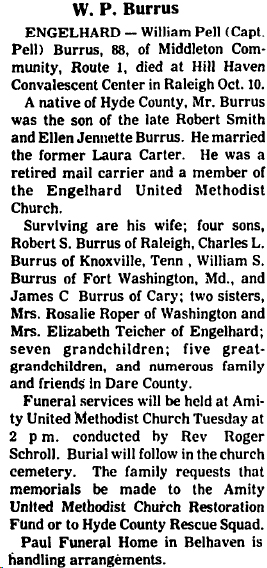 ENGELHARD - Laura Carter BURRUS, 95, of the Middletown community of Engelhard, died at Cary Manor in Cary. Mrs. Burrus, a native of Hyde County, was the daughter of the late Robert Edward and Dora Saunderson Carter. She was preceded in death by her husband of 68 years, William Pell Burrus who died in 1987. She was a member of the Engelhard United Methodist Church and resided at St. Luke's Home for Retired Women in Raleigh until recently. Surviving are three sons: Charles L. Burrus of Knoxville, Tennessee, William S. Burrus of Raleigh, and James C. Burrus of Cary; 8 grandchildren and 9 great-grandchildren. She was preceded in death by a son, Robert S. Burrus, and a daughter, Margaret Burrus Gibbs. Funeral services were held at 2 p.m. Thursday in the Amity United Methodist Church near Engelhard with the Rev. Tom Suplee officiating. Burial was in the church cemetery. Arrangements were by Paul Funeral Homes in Belhaven. (The Coastland Times - Sunday, September 26, 1993; pg. 12A)