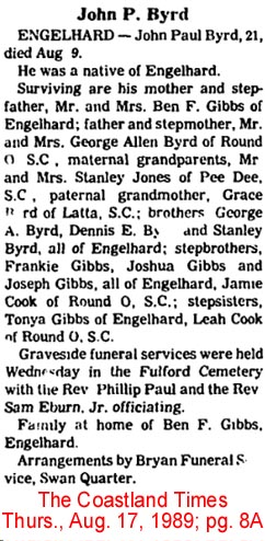 ENGELHARD, N.C. - Kenneth Dwayne BLANKS, 20, died July 16, 1991, in a Greenville hospital. Mr. Blanks was born in Norfolk. Survivors include his mother and step-father, Gayla B. and Allen E. Gibbs; five brothers: James Blanks, Richard Blanks, Allen E. Gibbs Jr., David K. Gibbs and Victor C. Gibbs; and maternal grandfather, Marvin Hodges, all of Engelhard; paternal grandfather, James A. Blanks of Pelham; and paternal step-grandmother, Rena Belle Gibbs of Engelhard. A memorial service will be at 2 p.m. Saturday in Engelhard Baptist Church. Burial will be private. Bryan Funeral Service, Swan Quarter, is handling arrangements. (The Virginian-Pilot - Wednesday, July 17, 1991; pg. 2D)