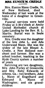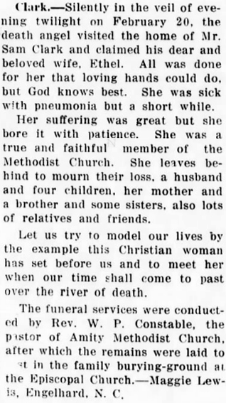 Camille B. Clarke, 93, of South Elm Street, Greenville, died Tuesday, April 10, 2007, at her home after a lengthy illness. Born at Wynn’s Folley in Hyde County on September 1, 1913, she was the daughter of the late Seth Gibbs Clarke and Laura Tankard Clarke. She graduated from Lake Landing High School in 1930, graduated from the former East Carolina Teacher’s College in 1934 with a Bachelor’s degree in Education. She later taught in the public schools in Scotland Neck and in Engelhard. After receiving her Master’s Degree from East Carolina Teacher’s College, she became dietitian for the college about 1950 and served in that capacity for many years. Miss Clarke was awarded the “Order of the Long Leaf Pine” in 1983 at the request of Governor James B. Hunt, Jr. She served commendably as a Regional Dietary Consultant in the Eastern Regional Office, Division of Health Services, N. C. Department of Human Resources, for ten years and culminating 43 years of state government and academic experiences. She held positions as instructor and dietitian at East Carolina University and Vocational Home Economics teacher in Northampton and Hyde County Schools. Funeral services will be held at 2:30 p.m. on Friday at the family plot in St. George’s Episcopal Church Cemetery at Lake Landing. The Reverend Robert Hobgood, Episcopal priest of Greenville will officiate. Surviving are six nieces and nephews, E. Royden Clarke, Jr. and Louis W. Clarke both of Engelhard, Florence Swindell Mitchell, Camille Swindell Arrington, Charles A. Swindell and James E. Swindell all of Raleigh. She was preceded in death by a brother, Edward Royden Clarke, Sr. and a sister, Florence Clarke Swindell. The family will receive friends after the funeral service at the home of Roy and Anna Clarke, 29954 U. S. Highway 264, Lake Landing. Arrangements are by Bryan Funeral Service, Swan Quarter. (Washington Daily News - Thursday, April 12, 2007)