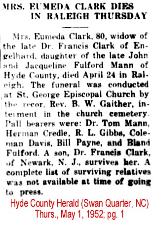 ENGELHARD - Elizabeth Mabry Hudson CLARKE, 91, died Thursday, June 21 at Pungo District Hospital in Belhaven. Born in Newport News, Va. on November 4, 1909, she was the daughter of the late Edward Wingfield and Willa Elizabeth Anderson Hudson. She was the widow of Edward Royden Clarke, Sr. who died February 2, 1979. She came to Hyde County in 1931 and was a member of St. George's Episcopal Church at Lake Landing. Surviving are two sons: Edward Royden Clarke, Jr. and Louis Wingfield Clarke, both of Lake Landing; 5 grandchildren and 7 great-grandchildren. Funeral services were at 2 p.m. Saturday, June 23 at St. George's Episcopal Church with the Rev. Gary Fulton officiating. Burial was in the church cemetery. Bryan Funeral Service in Swan Quarter is serving the Clarke family. (The Coastland Times - Sunday, June 24, 2001; pg. 12A)