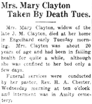 NOTE: Mary Rollins (Midyett) Clayton was not 20 years old at her death as the newspaper states...she was the 80 year old widow of John Monroe Clayton (1850-1922)