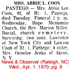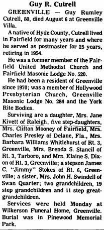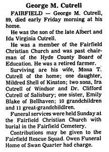 FAIRFIELD - Mona Turner CUTRELL, 93, long time resident of Fairfield, died September 1 at Bertie Memorial Hospital in Windsor. Born in Scranton, she was the widow of George M. Cutrell. She was a member of the Fairfield Christian Church and Fairfield Chapter #247, Order of the Eastern Star. Surviving are two sons: Ira G. Cutrell of Windsor and Dr. Clifford G. Cutrell of Salisbury; a daughter, Mildred C. Shell of Kinston; 8 grandchildren, 18 great-grandchildren and 1 great-great-grandchild. Funeral services were set for 11 a.m. Saturday in the Fairfield Christian Church with Dr. Melvin Styons officiating. Burial will follow in Fairfield Cemetery. Bryan Funeral Service in Swan Quarter is handling arrangements. (The Coastland Times - Sunday, September 5, 1993; pg. 14A)