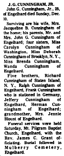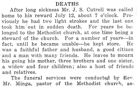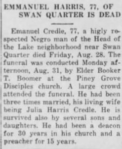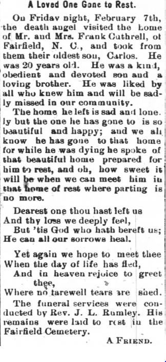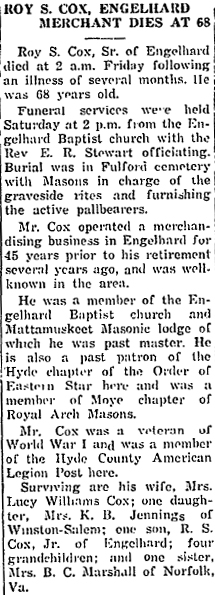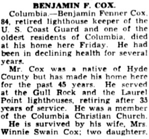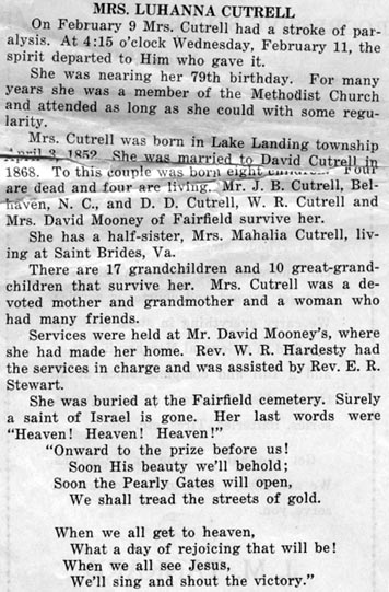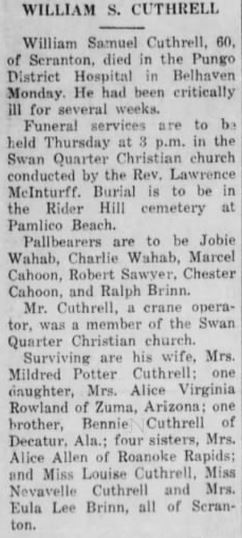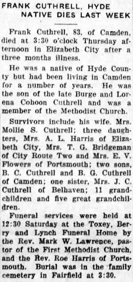 LAKE LANDING - Joseph Henry CUTHRELL, Hyde County native, died in Elizabeth City. He was the head of a large family and member of Watson's Chapel Church. He was buried in Soule Cemetery on Monday. He died after two years illness at the age of 78. He was the son of Henry and Nancy Pledger Cuthrell. He leaves three sons: N. and J.A. of Manteo and E.K. of Lake Landing; a daughter, Mrs. W.G. Marshall of Lake Landing; two sisters: Mrs. Albert Best of Stumpy Point and Mrs. Mary Spencer of Belhaven; two brothers: C. of Middletown and E.T. of Lake Landing; five step-daughters [not named]; 7 grandchildren and 8 great-grandchildren. (The Coastland Times - Friday, February 6, 1953; pg. 8)