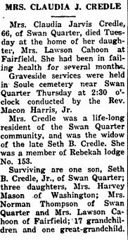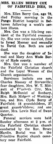 SWAN QUARTER - Mrs. Veronia Williams CUTRELL, age 93, died at the home of her daughter, Mrs. Nathan Cutrell Saturday at 7:15 p.m. after an illness of several months. She was a member of the Fairfield Primitive Baptist Church. Surviving are one daughter, Mrs. Nathan Cutrell of Swan Quarter; seven sons: Julian, Arthur, Clifton, Clyde and Lewis Cutrell, all of Chesapeake, Va., Robert Cutrell of Sweet Hall, Va. and Dallas Cutrell of Fairfield; one brother, W.J. Williams of Fairfield; one sister, Mrs. Robena Cahoon of Williamsburg, Va.; 22 grandchildren, 30 great-grandchildren and 1 great-great-grandchild. Graveside services were held this morning at 11 o'clock in the Fairfield Cemetery conducted by the Rev. R.E. Austin, assisted by the Rev. Leighton Lewis. (Washington Daily News - Monday, March 25, 1963)