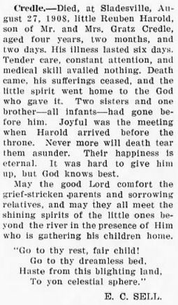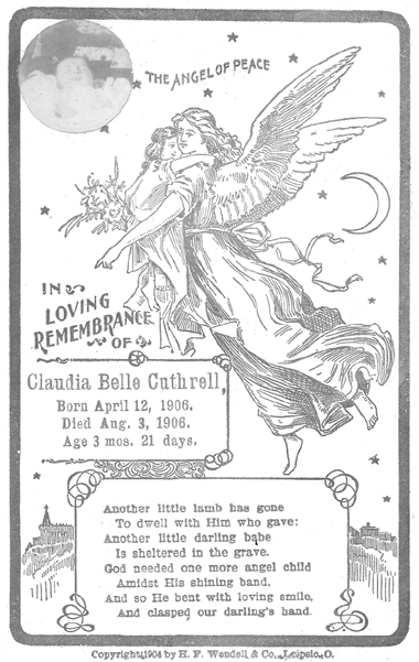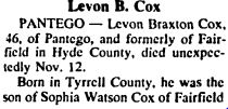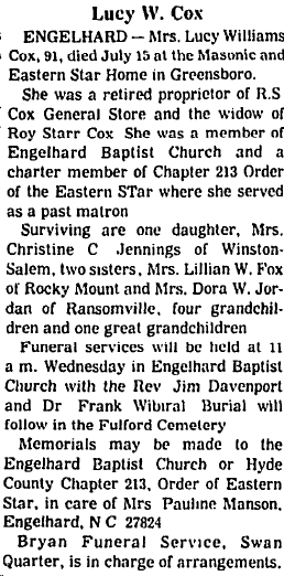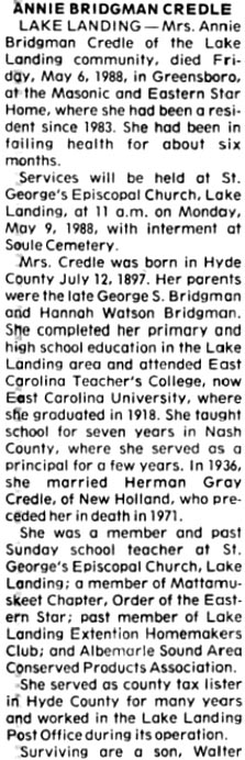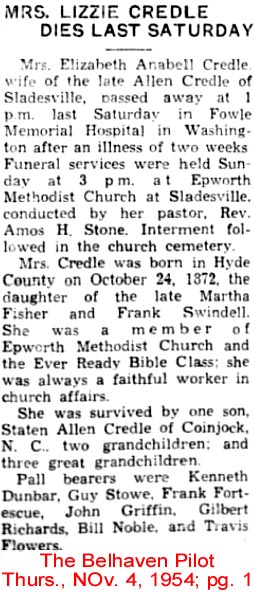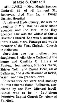 ENGELHARD - Ludie B.H. CUTHRELL, 86, died Friday at Pungo District Hospital. The graveside service will be Sunday at 3 pm in Soule Cemetery with Johnny Presley officiating. A native of Hyde county, Mrs. Cuthrell was the daughter of the late Bart [Bartlett] and Dellie [Abydilla] Pegram Hall and the widow of the late Leo Cuthrell. She was a member of the Fairfield Christian Church and worked at the former Fairfield School for many years. Mrs. Cuthrell is survived by a son, Russell E. Cuthrell of Fairfield; a daughter, Mrs. Floyd (Nina) Gibbs of Engelhard; 4 grandchildren and 5 great-grandchildren. Arrangements are by Bryan Funeral Service in Swan Quarter. (Washington Daily News - May 14, 1988; pg. 5) [Obit kindly submitted by Patricia Richard.]