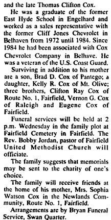 SCRANTON - Herbert Ray CLAYTON, 33, was found dead in the Tar River on November 3. Surviving are his father, Herbert Clayton and his mother, Neppie Clayton; his wife, Mary Slade; three sons, Herbert Ray Clayton, Jr., George Clayton and Christer Clayton; one sister, Helen Clayton of Washington; and six brothers: Keith Clayton and Ricky Clayton, both of Washington, Calvin Clayton of Kinston, and Ted Clayton and Marcus Clayton, both of Scranton. Funeral services were held November 7 in Weeping Mary Church of Christ, Scranton. Burial was in the Clayton family cemetery. Arrangements were by Rowsom Funeral Home, Columbia. (The Coastland Times - Tuesday, November 10, 1992)