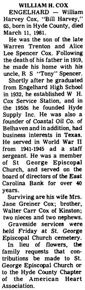 FAIRFIELD - William Steele CLAYTON, JR., 73, died August 20 in Pungo District Hospital in Belhaven. He was a native of Fayetteville, Tenn. and was the son of the late William S. and Elizabeth Buchanan Clayton. He served in the U.S. Navy and retired as a chief petty officer and later spent 15 years with civil service the Norfolk Naval Shipyard. During his service time he served in California, Pearl Harbor and retired in Norfolk, Va. He was a member of the Church of Christ in Fayetteville, Tenn. He moved to Fairfield in December 1991. Surviving are his wife, Jennie Simmons Clayton; a daughter, Morna Inez W. Owens of Virginia Beach, Va.; a brother, James Clayton of Fayetteville, Tenn. and two grandsons. Funeral services were set for 2 p.m. Saturday in the family plot in Fairfield Cemetery with the Rev. Roger Patton and the Rev. W. Thomas Clarke to officiate. The family will receive friends at the home. Bryan Funeral Service in Swan Quarter is handling arrangements. (The Coastland Times - Sunday, August 23, 1992)