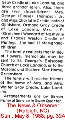 HYDE COUNTY, N.C. - Dora M. CUTLER, 74, died Sunday, November 17. She was born June 6, 1922 in Hyde County and was the daughter of the late George R. and Patcie Gibbs McKinney. She was a member of the National Federation for the Blind and the Seeing Hands Club. Mrs. Cutler was preceded in death by her husband, Ralph Cutler, and a son, Larry Cutler. Surviving are daughter, Gloria Payne of Winston-Salem; 3 grandchildren and 3 great-grandchildren; and niece, Joyce Matthews Page of Nashville. Graveside services are to be at 2 p.m. Tuesday at Rocky Mount Memorial Park with Rev. Lloyd Davis officiating. Arrangements are by Johnson Chapel of Nashville. (The Coastland Times - Tuesday, November 19, 1996; pg. 5A)