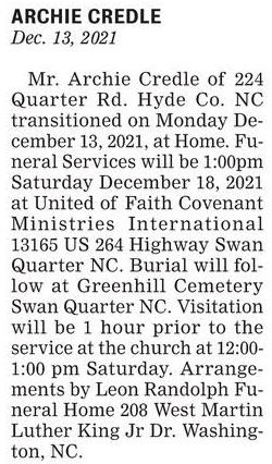 Mrs. Neppie Clayton of 369 Loop Road Scranton NC died on Sunday August 4,2024 at Home. Funeral services will be at 3:00pm Sunday August 11, 2024, at L.R. Memorial Chapel 208. W. Martin Luther King Jr. Dr. Washington, NC. Burial will follow at The Clayton Family Cemetery Scranton NC on Monday August 12, 2024, at 1:00pm. Public viewing will be one hour prior to the services Sunday August 11, 2024, from 2:00pm-3:00pm at L. R. Memorial Chapel 208 W. Martin Luther King Jr. Dr. Washington, NC. Other times the family will be receiving family and friends at the home. Professional And Caring Service has been entrusted to: Leon Randolph Funeral Home, 208 W. MLK Jr. Drive, Washington, North Carolina, 27889. Please remember the Clayton family in your prayers. (Leon Randolph Funeral Home)