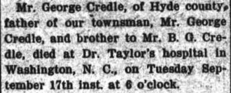 HYDE COUNTY - Mrs. Elizabeth CUTRELL died last Thursday at the age of 74. She and Mr. Jesse Cutrell had been married 52 years and were childless. (The Economist Weekly (Elizabeth City) - Tuesday, March 31, 1891)