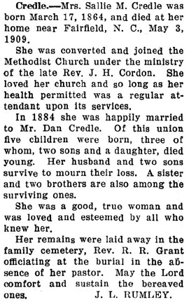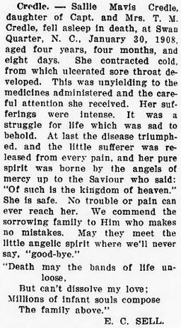 MISS JANIE CHADWICK OF FAIRFIELD DEAD - Funeral services for Miss Janie CHADWICK, 60, who died in a Columbia hospital Friday morning at 3 o'clock, were held from the Fairfield Methodist Church Saturday morning. Interment followed in the Fairfield cemetery. Miss Chadwick had been in ill health for several years. Surviving are one aunt, Mrs. Minnie Credle, and a number of cousins. (The Dare County Times - Friday, January 8. 1943; pg. 2)