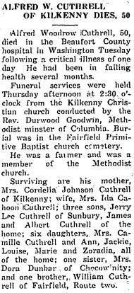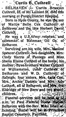 William Arthur Cuthrell, 87, of 21675 N. C. Highway 94, Fairfield, the Kilkenney Community, died Sunday, May 31, 2009, at Pungo District Hospital in Belhaven. Born in Tyrrell County, September 22, 1921, he was the son of the late Arthur Lester and Cordelia Johnson Cuthrell. He spent his working years as a farmer and was an avid hunter and fisherman, often providing guide services to hunters during the 1940’s. He was a member of Nazareth Church of Christ. Funeral Services will be held at 2:00 P.M. on Tuesday at the graveside in Bethlehem Primitive Baptist Church Cemetery, North Lake Road, Fairfield.Ray Everton will officiate. Surviving are his wife of almost 65 years, Etta Cahoon Cuthrell; two sons, Ronald L. Cuthrell and Ernie Cuthrell both of Fairfield; four daughters, Delia C. Mooney of Fairfield, Willene C. Brinn of Belhaven, Helen C. Martin of Greenville and Rita C. Marshall of Nashville; nine grandchildren and 14 great-grandchildren. He was preceded in death by a brother, Alfred Woodrow Cuthrell and a sister, Dora C. Dunbar. The family will receive friends at Bryan Funeral Service, Columbia Chapel on Monday evening between 7 p.m. and 8:30 p.m. and other times at the home. (The Coastland Times - Tuesday, June 2, 2009; pg. 6A)