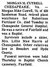 PORTSMOUTH, VA - James Aubrey CUTHRELL, 75, of York Drive, died Wednesday, June 7, in his residence. A native of Lake Landing, Mr. Cuthrell was retired from Newport News Shipbuilding as a sheet metal worker. He was a member of Asbury United Methodist Church and a Navy veteran of World War II. Survivors include his wife, Joyce M. Cuthrell; three daughters: Laura Ward of Kill Devil Hills, Sheila Grimsley of Portsmouth, Va., and Annette Cuthrell of Raleigh; three sons: Joe Cuthrell of Suffolk, Va., Ron Cuthrell of Chesapeake, Va., and Aubrey Cuthrell, Jr. of Portsmouth, Va.; a brother, Keith Cuthrell of Lake Landing; 12 grandchildren; and 2 great-grandchildren. Funeral services were set for 1 p.m. Saturday in Sturtevant Funeral Home, Portsmouth Blvd. Chapel, by Dr. Ted Barton, with burial to follow in Meadowbrook Memorial Gardens. (The Coastland Times - Sunday, June 11, 1995; pg. 5A)