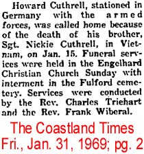 FAIRFIELD - Russell Earl CUTRELL, 68, of Fairfield, died Tuesday, March 16, in Pungo District Hospital. A Hyde County native, he was the son of the late Leo and Belle Hall Cutrell. He served in the U.S. Army during World War II and was awarded the Purple Heart. He was a member of the Veterans of Foreign Wars, the American Legion, and was a teacher in trade and industrial education at Mattamuskeet School in Hyde County for 20 years, retiring in 1990. He was a member of the Athletic Boosters Club and the N.C. Trade and Industrial Education Association. Surviving are his wife, Carolyn Blake Cutrell; a son, Russell Steven Cutrell of Fairfield; a daughter, Mary Tonda Cutrell of Wanchese; a sister, Nina C. Gibbs of Engelhard; and 3 grandchildren. Funeral services will be held at 2:30 p.m. Thursday in Fairfield Christian Church. Dr. Melvin Styons, pastor, will officiate. Burial will follow in Fairfield Cemetery. Arrangements are by Bryan Funeral Home, Swan Quarter. (The Coastland Times - Thursday, March 18, 1993; pg. 6A)