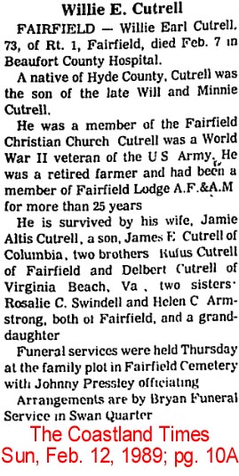 FAIRFIELD, N.C. - Carl CUTRELL, 89, of Route 1, Fairfield, died Dec. 27, 1992, in Beaufort County Hospital. A native of Hyde County, Cutrell was the son of the late John Tooley and Pinie Armstrong Cutrell. He was a long-time member of Fairfield Christian Church and was a retired farmer. He was married to Blanche Swindell Cutrell who died in 1983. Surviving are two daughters, Doris C. Kerr of Washington and Masil C. Jones of Portsmouth, Va.; 5 grandchildren; and 6 great-grandchildren. Funeral services will be at 11 a.m. Tuesday in Fairfield Christian Church. Dr. Melvin Styons will officiate. Burial will follow in Fairfield Cemetery. The family suggests that memorials may be sent to Fairfield Christian Church, Fairfield, N.C. Arrangements are by Bryan Funeral Service, Swan Quarter. (The Virginian-Pilot - Monday, December 28, 1992; pg. 4D)