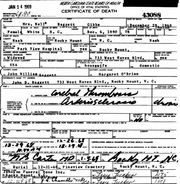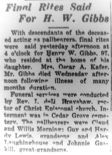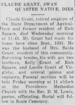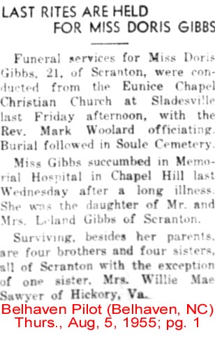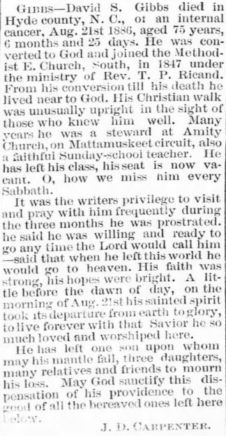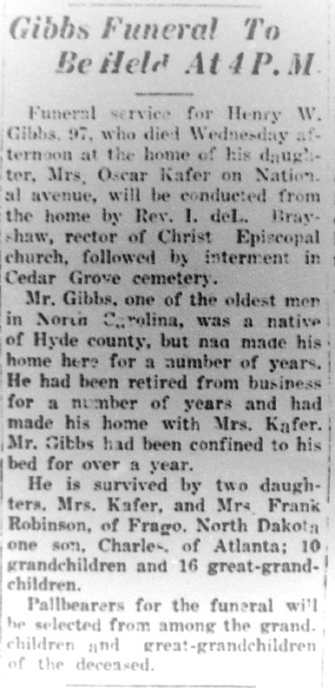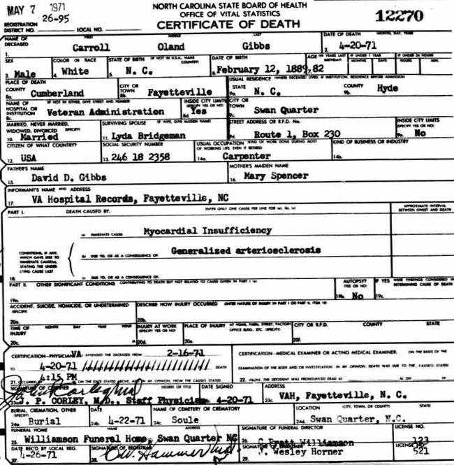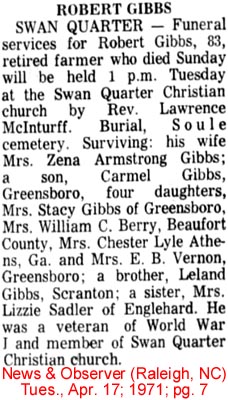 SWAN QUARTER - Funeral service for Carroll O. Gibbs, 82, farmer, who died Tuesday will be held at 3 p.m. Thursday at the Rose Bay Missionary Baptist Church by Rev. Macon Harris, Jr. Burial at Soule Cemetery. Surviving: his wife, Mrs Lyda B. Gibbs; a daughter, Mrs. Marjorie Carawan of Belhaven; a son, Carroll D. Gibbs of Swan Quarter; two sisters: Mrs Paul Edmondson of Belhaven and Mrs. Ernest Manly of Portsmouth, Va.; a grandchild and two great-grandchildren. He was a veteran of World War I. (Unknown 1971 newspaper obituary provided by Donna Miltier) [death certificate says Carroll died on April 20, 1971]