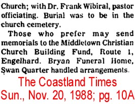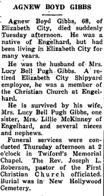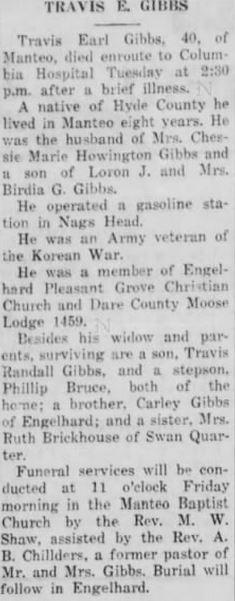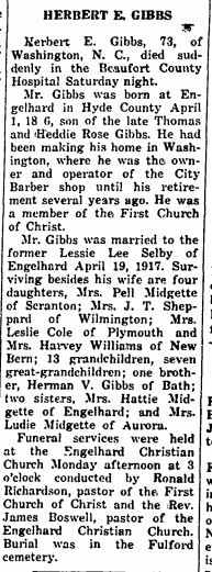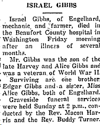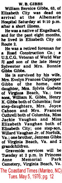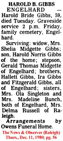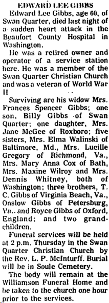 ENGELHARD - Calvin Coolidge GIBBS, SR. age 51, of Engelhard, died Sunday. He was born Sept. 30, 1926 in Hyde County to Ozrow and the late Picola Carawan Gibbs. He was employed with Tideland Electric Membership Corp. in Engelhard. Surviving are his wife, Mrs. Elizabeth Douglas Gibbs of Engelhard; four brothers: Linwood Gibbs of Engelhard, Chesley Gibbs of Swan Quarter, Max Gibbs of Chesapeake, Va., and Jimmy Gibbs of Norfolk, Va.; one sister, Mrs. Verna Carawan of Engelhard; one grandchild. Graveside funeral services were held Tuesday at Soule Cemetery, conducted by the Rev. Frank Wibiral. (The Coastland Times - circa February 22, 1978) [Submitted by Sandy Carawan of Engelhard, N.C.]