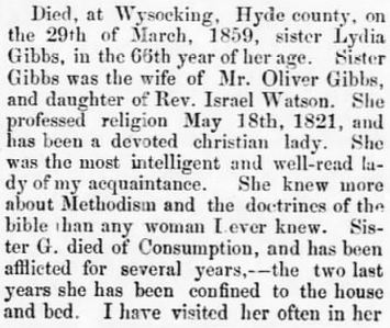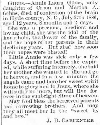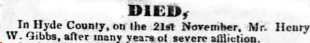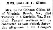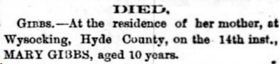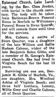 HYDE CO., N.C. - Amanda Ann GIBBS, 94, died June 21, 1991, in a nursing home. Miss Gibbs was a native of Hyde County. Survivors include two brothers, John N. Gibbs of Chesapeake and Davis H. Biggs of Grantsboro; and three sisters, Lydia I.G. McKinney of Chesapeake, Mollie Gibbs of Edenton and Rosa G. Toler of Wanchese. The graveside service will be conducted at 11 a.m. Monday in Fulford Cemetery by Steve Bryan. Friends may join the family from 3 to 5 p.m. today at Bryan Funeral Service, Swan Quarter. (Virginian-Pilot - Sunday, June 23, 1991; pg. B2)