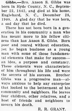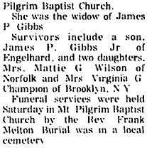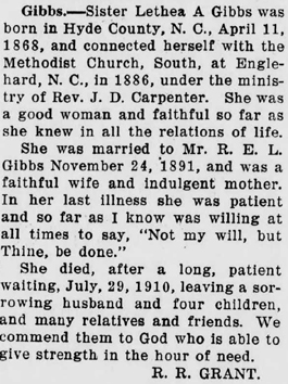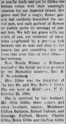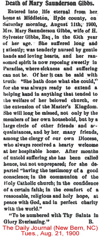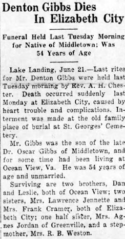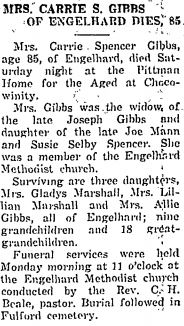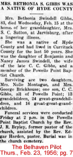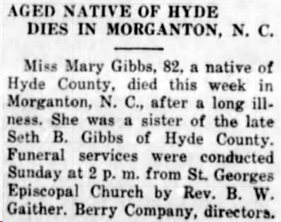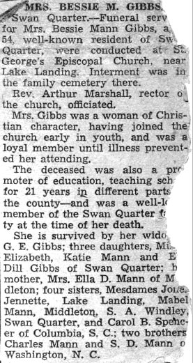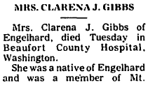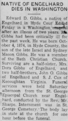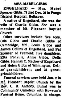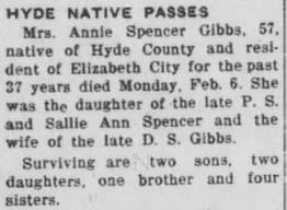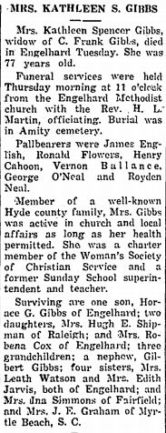 MRS. ALICE SPENCER GIBBS PASSES AT ENGELHARD - Mrs. Alice Spencer GIBBS, 61, prominent Engelhard woman and lifelong resident, died at the family home Monday and was interred Tuesday at St. George's churchyard, the funeral being conducted in the church by Rev. Oscar Edmonds, Baptist minister. Mrs. Gibbs was twice married, her first husband being the late Warren Cox, by which union two sons survive: W.H. Cox of Engelhard and Warren C. Cox of Kinston. Her second husband was O.B. Gibbs who died about four years ago. Her parents were the late C.C. and Mary Spencer. Pallbearers were Cecil Gibbs, Cecil Silverthorne, Jabin Berry, Royden Clarke, Max Hodges and Johnny Sanderson. She is survived by three brothers: R.S., Monroe, and Sam D. Spencer of Engelhard. (The Coastland Times - Friday, April 6, 1951; pg. 8)
