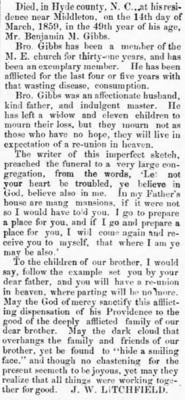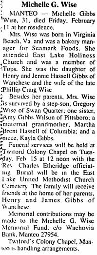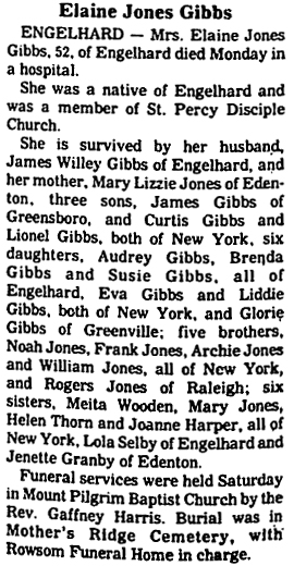 WASHINGTON - Catherine Ann GIBBS, 48, died February 22 in Beaufort County Hospital. She was the daughter of the late James L. and Shirley B. Gibbs and was born in Hyde County. She was a member of Star of Zion Disciple Church in Fairfield and was a factory worker. Surviving are daughter, Marsha Gibbs of Raleigh; sons: Christoval Gibbs of Greensboro and Malcolm J. Gibbs of Washington; sisters: Dolly Gibbs and Elaine Gibbs of Engelhard, Ellen Spencer of Fairfield and Flora Gibbs of Manteo; brother, James Gibbs of Washington; and two grandchildren. Funeral services will be held at 2 p.m. Tuesday, Feb. 26 at Star of Zion Disciple Church. Burial will follow in Fairfield Cemetery. Arrangements by Rowsom Funeral Home in Columbia. (The Coastland Times - Tuesday, February 26, 2002; pg. 6A)