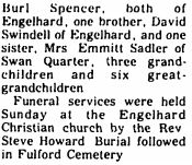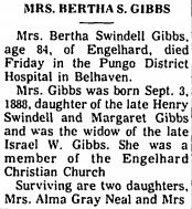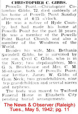 ENGELHARD - Cecil Bruce GIBBS, 79, of Route 1, died in Chapel Hill following surgery. A Hyde County native, he was the son of the late Thomas and Mary Spencer Gibbs. He was a long time member of the Middletown Christian Church where he also served as elder. Surviving are his wife, Zuma Nixon Gibbs; two sons: Allen Forest Gibbs and Donnie Wayne Gibbs, both of Engelhard; 7 grandchildren and 5 great-grandchildren. He was preceded in death by a son, Agatha B. Gibbs. Funeral services will be held at 2 p.m. Friday in the Middletown Christian Church with the Rev. James Davenport officiating. Burial will follow in Oak Dale Cemetery at his home. Arrangements are by Bryan Funeral Service, Swan Quarter, where the body will lie in state until noon on Friday when it will be moved to the church. (The Coastland Times - Thursday, March 4, 1993)