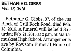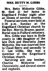 ENGELHARD - Ann Berry GIBBS, 55, of Engelhard, died Wednesday, May 21, at Pitt County Memorial Hospital in Greenville. She was the daughter of Annie Mildred Berry and the late Olivia [this should read Otiva] W. Berry. Mrs. Gibbs graduated from East Hyde High School in 1959, after which she attended Hicks Beauty Academy in Norfolk, Va. She owned and operated Ann's Beauty Salon for 30 years. She was a resident of Cross Creek Health Care Center of Swan Quarter. Surviving, in addition to her mother, are her sons: Sonny L. Gibbs of Wilmington and Ricky W. Gibbs of Greenville; sisters: Jane B. Gibbs and Emma B. Wright, both of Fairfield, and Julia B. Alloggio of Virginia Beach, Va. A memorial service will be held at 2 p.m. Sunday at her residence in Engelhard. Bryan Funeral Service, Swan Quarter, is serving the Gibbs family. (The Coastland Times - Sunday, May 25, 1997; pg. 12A)