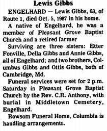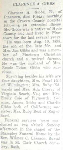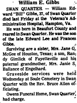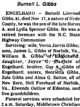 SWAN QUARTER - Carley Cawien GIBBS, 61, died August 11 in Pungo District Hospital in Belhaven. A native of Fairfield, he was the son of the late Lorn Jones and Birdie Blanche Gibbs. He was a member of the Engelhard Assembly of God Church and was a retired driver for a seafood company. Surviving are two sons: Carley Jefferson Gibbs and Benjamin Franklin Gibbs, both of Swan Quarter; a daughter, Lorann Gibbs Asby of Kitty Hawk; a sister, Ruth G. Brickhouse of Swan Quarter; and 3 grandchildren. A son, Fred B. Gibbs, preceded his father in death in 1985. Funeral services will be held at 11 a.m. Saturday at the Gibbs family cemetery on the Engelhard-Fairfield Road. Larry Weaver of the Gum Neck Church of Christ will officiate. Arrangements are by Bryan Funeral service in Swan Quarter. (The Coastland Times - Thursday, August 12, 1993; pg. 8A)