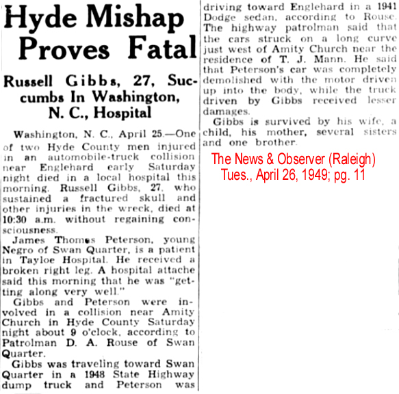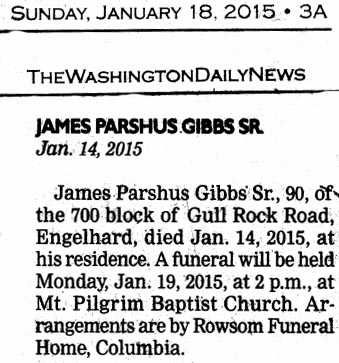 Mr. Caleb GIBBS, JR., 85, of 1719 Quarter Road, Swan Quarter, died Sunday, July 25, 2010, at Cross Creek Nursing Center in Swan Quarter. A funeral will be conducted at 2 p.m. Saturday in Star of Zion Church of Christ with Elder Daniel Gilliam officiating. Arrangements are by Rowsom Funeral Home, Columbia. (Washington Daily News - Friday, July 30, 2010)