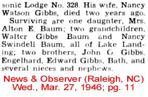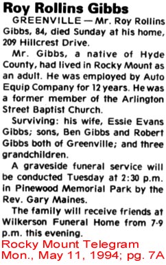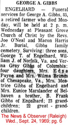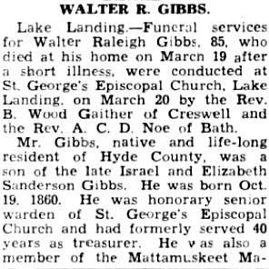 ENGELHARD - Charles Gilbert GIBBS, 77, died Friday, February 23 at Beaufort County Hospital in Washington. Born in Hyde County on July 8, 1923, he was the son of the late Closs Cordon and Maude Alice Gibbs. Active in local business and community affairs, he continued the operation of C. Gilbert Gibbs Store which was founded by his late father in 1895. He was a farmer and served as a member of the board of directors of the East Carolina Bank beginning in 1943 and served as president between 1962 and 1979. He then returned to the board as a director where he served until his death. He was a member of the Engelhard United Methodist Church. Surviving are his wife, Anna Mae Harris Gibbs; sons: Gregory C. Gibbs of Raleigh and Charles Gilbert Gibbs, Jr. of Engelhard; daughter, Regina A. Gibbs of Engelhard; and 4 grandchildren. Besides his parents he was preceded in death by brothers, Lancy Wade Gibbs and Lambert Gibbs, and a sister, Regena Gibbs. Funeral services were held Feb. 25 at the family plot in Amity United Methodist Church Cemetery, Lake Landing. The Rev. Ray L. Sparrow and the Rev. Valerie Ballance officiated. Arrangements are by Bryan Funeral Service in Swan Quarter. (The Coastland Times - Tuesday, February 27, 2001; pg. 11A)