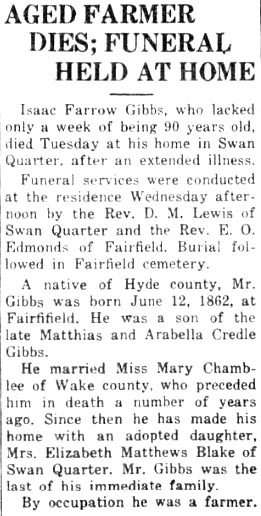 FAIRFIELD - Benjamin Alonzo GIBBS, SR., 67, retired farmer of Rt. #1, Fairfield, died April 24 in Beaufort County Hospital. A native of Hyde County, he was the son of the late Wilson Lucas and Clarise Spencer Gibbs. He was a member of the Pleasant Grove Church of Christ. Surviving are a son, Benjamin A. Gibbs, Jr. of Washington; five daughters: Clara Faye Lane of Plymouth, Betty G. Cherry of Washington, Wilsie Marie Meekins of Bath, Blondie Rae Sprouse of Belhaven, and Teresa Gail Sprouse of Pinetown; a sister, Ethel G. Smith of Fairfield; and 11 grandchildren. Funeral services were held on Friday in Pleasant Grove Church of Christ. Burial followed in the family cemetery near the church. Arrangements were by Bryan Funeral Service, Swan Quarter. (The Coastland Times - Sunday, April 28, 1991)