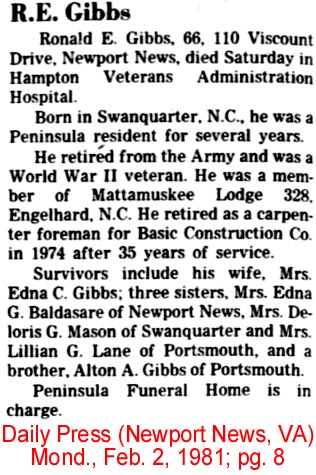 PORTSMOUTH - Alton A. GIBBS, 79, died July 31. Mr. Gibbs was born in Hyde County, resided in Portsmouth and was a member of Grove Park Baptist Church. He was the widower of Virginia W. Gibbs. Mr. Gibbs retired as a water department supervisor for the City of Norfolk. He served in the Coast Guard during World War II and was a 50-year member of Mattamuskeet Masonic Lodge #328 AF & AM in Engelhard. Survivors include two daughters: Della G. Oliver and her husband Buddy of Virginia Beach, Va., and Judy Terminellow of Auburndale, Florida; three sisters: Edna Baldesare and her husband Paul of Newport News, Va., Delores Mason and her husband Kenneth of Chesapeake, Va., and Lillian Lane of Kitty Hawk; a sister-in-law, Edna Gibbs of Engelhard; four grandchildren: Jason Oliver, Ellen Oliver, Beth Mundey and Mark Klebau; and several great-grandchildren, nieces and nephews. He was predeceased by his brother, Ronald E. Gibbs. A funeral services was conducted by Rev. Terry Riddle and was held at Grove Park Baptist Church. Burial was in Oliver Branch Cemetery. Arrangements were by Sturtevant Funeral Home in Portsmouth. (The Coastland Times - Tuesday, August 4, 1998; pg. 4B)