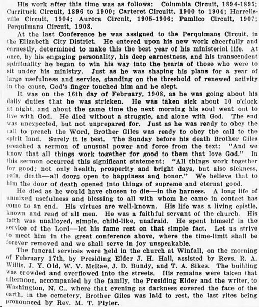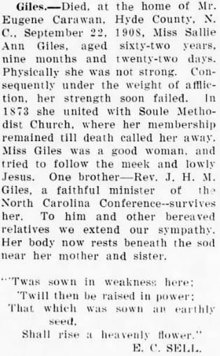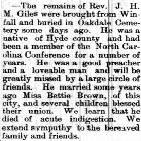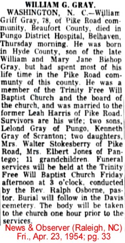 WAVES - Mrs. Sadie W. GRAY, wife of D.L. Gray, died Saturday at 10 a.m. at her home in Waves, following a long illness. She was one of the most prominent citizens of the island and a highly regarded member of a noted family. She is survived by her husband; a son, Asa H. Gray; a grandson, Asa Jr.; and a great-grandson, Rudy; one brother, F.H.N. Midgett of Waves; three sisters: Mrs. Zion Midgett of Waves, Mrs. Warren Midgett and Miss Belle Midgett of Manteo. She was the daughter of the late Israel B. and Nancy Ballance Midgett. Funeral services were conducted Sunday at 2 p.m. by Rev. P.M. Porter, pastor of Fairfield Methodist Church, of which she was a life long member. The choir sang "Abide With Me" and "Nearer My God to Thee." Miss Norma Bethany Gray accompanied on the piano. The casket was covered with a pall of white carnations and Easter lilies. Dewey Midgett, Creedon Midgett, Horatio Midgett, Harris Midgett, Cecil Midgett and Woodrow Edwards served as pallbearers. Burial was in the family cemetery. (The Coastland Times - Friday, November 13, 1953; pg. 8)