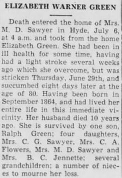 MANTEO - Rosey Lee GREEN, 78, of Route l, died September 30 in an Elizabeth City hospital. Mrs. Green was born in Swan Quarter. She was the widow of James Green. Survivors include a daughter, Clara M. Peterson of Manteo; three sons: Allen Peterson of Hyde County, Murphy Peterson of Manteo and Arnold Peterson of Newark, N.J.; a brother, Charlie Spencer of Hyde County; 14 grandchildren and 7 great-grandchildren. Funeral services were held Monday in Old Richmond Baptist Church, Swan Quarter, by the Rev. Calvin Moore. Burial was in the Green Hill Cemetery, Swan Quarter. Walson Funeral Home, Elizabeth City, handled arrangements. (The Coastland Times - Tuesday, October 6, 1992)