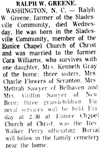 Mrs. Charity Jones GREENE, 86, formerly of Belhaven, died Wednesday, July 19, 2006, at the home of her daughter, Claudia Griffin. A funeral will be conducted at 1 p.m. Tuesday at St. Reddick Missionary Baptist Church in Belhaven with the Rev. James Harris officiating. Burial will follow at Northside Cemetery in Belhaven. The body will lie in state for viewing at the church one hour prior to the service. Mrs. Greene was born in Hyde County on March 31, 1920. She was the daughter of the late James Jones and Luzzianna Boomer Jones. She was a graduate of Beaufort County High School in Pantego. She was a retired seafood instructor with the Beaufort County Community College. She was a voter registration contact person, a mentor recruiter for the GED program and provided transportation to senior citizens and friends. On July 11, 1948, she married Nathaniel Greene, who preceded her in death on Feb. 15, 2006. She was a lifelong member of St. Reddick Missionary Baptist Church and served as president of the senior choir and as a Sunday School teacher. She also served on the church’s mother board. Survivors include three daughters, Cecelia W. Williams and Claudia Griffin, both of Virginia Beach, Va., and Brenda Sharpe of Hampton, Va.; one son, Glenwood Greene of Belhaven; one sister, Priscilla Welch of Norfolk, Va.; four grandchildren; and six great-grandchildren. The family will receive friends at the home of John and Rebecca White, 520 Pamlico St., Belhaven. Arrangements are by Randolph Funeral Home, 219 N. Bonner St., Washington. (Washington Daily News - Monday, July 24, 2006)