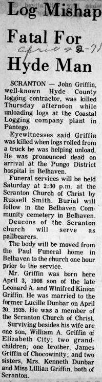 Mrs. Marjorie Jones Griffin, age 85, a resident of Washington, NC died Monday March 23, 2009 as a result of an automobile accident. A funeral service will be held 11 a.m. Saturday March 28, 2009 at Paul Funeral Home of Washington officiated by Fred Wilson. A graveside service will be held 3 p.m. Saturday at Fairfield Cemetery in Hyde County. Mrs. Marjorie was born in Fairfield on May 24, 1923, daughter of the late Robert William “Capt. Bob” Jones, Sr. and the late Winnie Mae Kemp Jones. She was a graduate of Fairfield High School and continued her education at Salisbury Business College. Mrs. Marjorie married Richard S. Pinner, Jr. on September 16, 1944. Upon moving to Belhaven she became co-owner and operator of Pinner Shoe Store. Later they moved extensively with the United States Navy. Upon moving to Washington she married Russell David Griffin on November 26, 1977 who preceded her in death on December 24, 1992. Mrs. Griffin was a bookkeeper for Harris Hardware and the Beaufort County Home. She was a member of First Baptist Church of Chocowinity. Mrs. Griffin loved all animals and music. She played the piano or organ for various churches throughout her life and was currently playing at Unity Church of Christ. Survivors include a son: Richard S. “Joe” Pinner, III and his wife Cynthia of Greeley, CO; a sister Irene Field of Salisbury, NC; a sister-in-law: Jean C. Jones of Washington; two grandchildren: Daniel J. Pinner of Greeley, Co and Karen Pinner Frizzell and husband Jordan of Gunnison, CO. Mrs. Griffin was anticipating the birth of her first great granddaughter. She was preceded in death by a brother: Robert W. “Bud” Jones and two sisters: Edith Carawan and Ruby Larson. The family will receive friends 6 p.m. to 8 p.m. Friday March 27, 2009 at Paul Funeral Home of Washington. Following graveside services in Fairfield, a reception will be held at Lake Mattamuskeet Lodge. Paul Funeral Home of Washington is serving Mrs. Griffin’s family. (Washington Daily News [Washington, NC] – Friday, March 27, 2009)