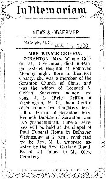 ELIZABETH CITY - Lucille Dunbar “Grandma Lucy” Griffin, 94, passed away February 18, 2007 at the Albemarle Hospital in Elizabeth City, NC. Mrs. Griffin was born in Royal, NC, on November 10, 1912, the youngest of eight children (six of whom lived), she was the daughter of the late Hertford and Julie Dunbar and the widow of the late John Griffin, all of Scranton, NC. She lived in Scranton, NC, until 1972, when she moved to Elizabeth City. She had three great loves in life; her family, her church, and her college. She was baptized at the age of 12 and was active in the Scranton Christian Church during her years there. After moving to Elizabeth City, she was active at the Elizabeth City Church of Christ until the founding of Towne South Church of Christ, where she maintained membership until the time of her death. She also enjoyed attending South Mills Church of Christ on Sunday evenings. From the time she first served as a camp mother at Camp Roanoke on the campus of Roanoke Bible College in 1954, she had a love affair with Roanoke Bible College. Upon moving to Elizabeth City, she served as assistant bookstore manager. Upon retirement, she began volunteering in the cafeteria, a job she continued until her entering the hospital in late January. She considered all the students her grandchildren — hence, “Grandma Lucy.” Surviving is her son, William A. “Bill” Griffin and his wife Trish, of Elizabeth City; her grandchildren, Mark Griffin and his wife Susan, of Palm City, FL., Carol Flowers and her husband Danny of Elizabeth City, her great-grandchildren, Colton Griffin of Palm City, FL., Kristen and Cassidy Flowers, of Elizabeth City; and special nieces and nephews, as well as her wider family of RBC alumni. She was predeceased by one great-grandson, Jake Griffin, as well as all her siblings: Lillian Dunbar Hollowell, Margaret Dunbar Bing, Allene Dunbar Credle, Kenneth Dunbar, and Keith Dunbar. A funeral service will be held Wednesday February 21, at 10 a.m. in the Chapel of the Blanton Center at Roanoke Bible College with Ronnie Woolard officiating. A funeral service will also be held at 4 p.m. Wednesday at the West Belhaven Church of Christ in Belhaven, NC. Burial will be in the Belhaven Community Cemetery. The family will receive friends at Twiford Funeral Home, 405 East Church Street, on Tuesday evening February 20, from 7 p.m. to 8:30 p.m. and following the services in Elizabeth City and Belhaven, and other times at the home of her son, at 715 First Street, Elizabeth City. Twiford Funeral Home, 405 East Church Street, Elizabeth City, is assisting the Griffin family with arrangements. (Washington Daily News (Washington, NC) – Tuesday, February 20, 2007)