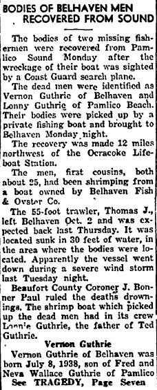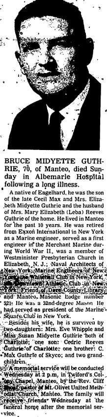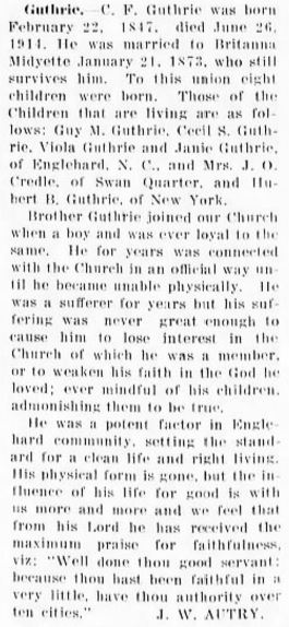 Cecil Samuel GUTHRIE, 74, died Saturday of last week in the nursing home of Manteo after a long illness. He was a native of Engelhard and had lived in Manteo for the past 9 years. He was a former employee of the Hunt Oil Co. and was a captain of a takner until he retired 9 years ago. He was the son of Christopher and Mrs. Brittania Midgett Guthrie. He was a member of the Mt. Olivet Methodist Church and a member of Manteo Lodge #682. He is survived by his wife, Mrs. Betty Midgett Guthrie of Manteo; two sons: Max Guthrie of Italy and Bruce Guthrie of New York; one sister, Mrs. Rose Credle of Norfolk; one brother, Hubert Guthrie of Skyco; and 7 grandchildren. Funeral service were conducted Sunday at 2:30 in the Mt. Olivet Methodist Church at Manteo by the Rev. Louis A. Aitken, pastor. Burial was in the Cudworth Cemetery at Wanchese. (The Coastland Times - Friday, December 19, 1958; pg. 8)