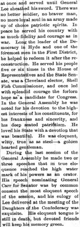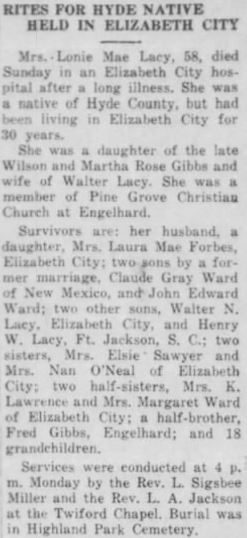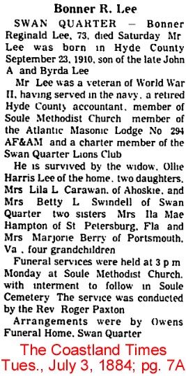 Thomas W. LEE, 69, native of Hyde County, died February 14 after being ill for nine years. He leaves one daughter, Wilhemina Lee of Norfolk; one son, John Thomas Lee of Portsmouth, Va.; two brothers: John A. Lee of Swan Quarter and George F. Lee of Norfolk; 3 grandchildren. Funeral services were conducted at the home of his brother, John A. Lee, at 2 o'clock Friday by his pastor, Rev. D.M. Lewis, Methodist minister. Burial was in Soule Cemetery. (The Coastland Times - Friday, February 23, 1951; pg. 6)