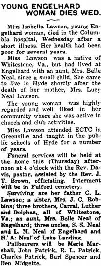 ENGELHARD - Miss Helen M. LAVENDER, 63, died Tuesday in Raleigh. Funeral services will be held at St. George's Episcopal Church near Engelhard at 2 p.m. Thursday by the Rev. Wesley Lucas. Burial will be in the church cemetery. She was a member of St. George's Church. Surviving are one sister, Mrs. W.E. Haynes of Raleigh; and one brother, B.A. Lavender of Engelhard. (The News & Observer - Wednesday, March 20, 1963) [Obituary kindly submitted by Pat Richard]