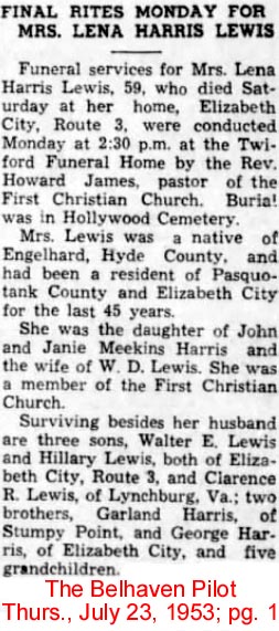 ENGELHARD - Alice Virginia Dunbar LEWIS, 89, a resident of Cross Creek Health Care Center and formerly of North Lake Road, died Wednesday, October 29 at Cross creek. Born in Hyde County on October 28, 1914, she was the daughter of the late John Roland and Caddie Owens Dunbar. She was married to John Leslie Lewis who survives and resides at Cross Creek. She was a member of Pleasant Grove Church of Christ. Surviving in addition to her husband are a son, Reginald R. Lewis of Norfolk, Va.; a brother, Edward Dunbar of Marietta, Ga.; two sisters: Caddie D. Burney of Tallahassee, Fla. and Mary Brickhouse of Aurora; 3 grandchildren and 2 great-grandchildren. Funeral services will be at 1:00 p.m. on Nov. 2 at the family plot in Fulford Cemetery with James Scheffler officiating. Arrangements are by Bryan Funeral Service in Swan Quarter. (The Coastland Times - Sunday, November 2, 2003; pg. 14A)