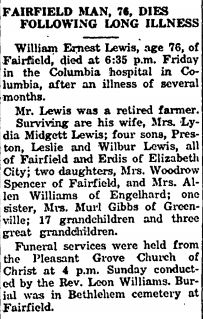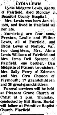 FAIRFIELD - William Preston LEWIS, 89, of Route 1, and more recently a resident of Cross Creek Health Care Center, died Sunday, September 28, at Pungo District Hospital in Belhaven. Born in Hyde County on December 26, 1907, he was the son of the late William Ernest and Lydia Midgette Lewis. He was the retired proprietor of the former Preston-Lewis Store on the Fairfield-Engelhard Road. Surviving are his wife of 67 years, Mae Spencer Lewis; a daughter, Elgie Lewis Midyette; three brothers: Leslie Lewis and Wilbur L. Lewis, both of Fairfield, and Erdis Lewis of Elizabeth City; two sisters: Alma L. Williams and Erma Dell L. Spencer, both of Fairfield; 6 grandchildren and 6 great-grand- children. He was preceded in death by a daughter, Diana Keyzer, who died April 25, 1982. Funeral services will be held at 11 a.m. Wednesday at the family plot in Fulford cemetery. Steve Bryan and Phil Emmert will officiate. Arrangements are by Bryan Funeral Service in Swan Quarter. (The Coastland Times - Tuesday, September 30, 1997; pg. 5A)
