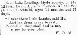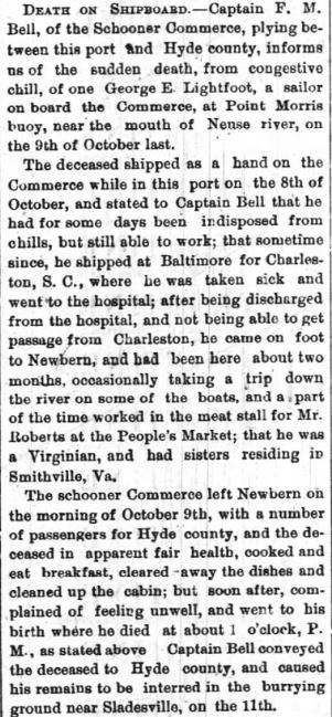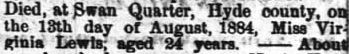 HYDE COUNTY - Miss Lizzie LINCOLN, age 22, died suddenly last week at her grandmother's, Mrs. Frances Weston. (The Economist Weekly (Elizabeth City) - Tuesday, March 22, 1892)