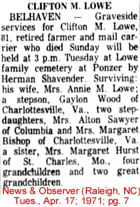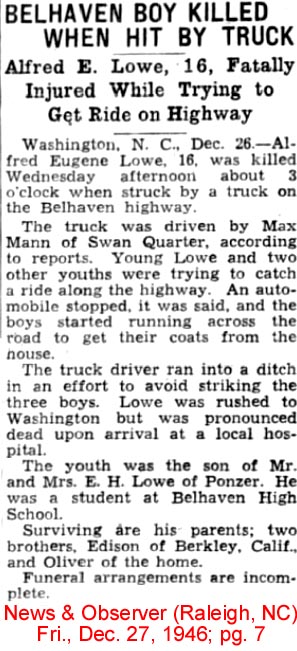 BELHAVEN - Edison Bryan LOWE, 74, died at his home on November 15. Born in Hyde County on August 5, 1926, he was the son of the late Eugene and Lena Rhem Lowe. He was a veteran of World War II having served in the U.S. Air Force. He attended the former East Carolina Teacher's College and graduated from UCLA at Berkley, California. Surviving are three nephews: Russell, Bryan and Eugene Lowe, all of Nags Head; a sister-in-law, Mrs. Angie Lowe of Nags Head; a grand-nephew, Ethan Lowe; and a grand-niece, Tori Lowe. He was preceded in death by two brothers, Harvey Lowe and Eugene Lowe. A memorial service will be held at 1 p.m. Sunday, Nov. 19 at the gravesite in the family cemetery. Arrangements by Bryan Funeral Home in Swan Quarter. (The Coastland Times - Sunday, November 19, 2000; pg. 16A)