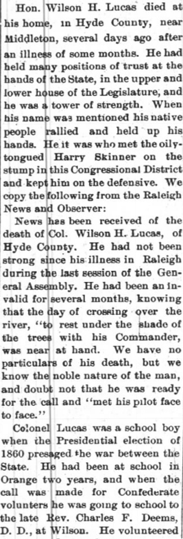 Clement H. LASSITER was murdered in Hyde County on December 6, 1852 by Elder George Washington Carawan. (Tarboro Press - December 11, 1852 from the book Deaths & Marriages from Tarboro, NC Newspapers 1824-1865 by Hugh Buckner Johnston; Wilson, NC; copyright 1983)