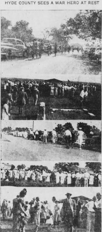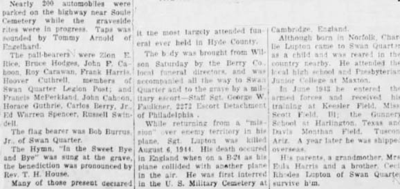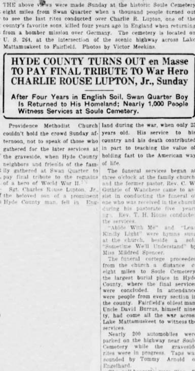 REBURIAL RITES SET FOR SOLDIER IN HYDE - Swan Quarter, July 23 - The remains of Sgt. Charlie R. LUPTON, JR. will arrive in Swan Quarter Saturday. Sgt. Lupton was killed August 6, 1944, while serving as a turret gunner on a B-24 in England when returning from a mission over enemy territory. His plane and another collided in mid-air. The body was removed from the U.S. Military Cemetery in Cambridge, England. Sgt. Lupton was born January 31, 1921 in Norfolk, Va., son of Mr. and Mrs. C.R. Lupton. He came to Swan Quarter while a small child and was reared in the county, attending Swan Quarter High School and Presbyterian Junior College. He entered the Army in June 1943 and trained at Keesler Field in Mississippi, Scott Field in Illinois, Gunnery School at Harlingen, Texas, and Davis-Monthan Field in Tucson, Arizona, before being shipped overseas in July 1944. Funeral services will be held from Providence Methodist Church on Sunday afternoon at 3 o'clock conducted by the Rev. T.H. House, pastor, and assisted by the Rev. C.W. Guthrie of Wanchese, a former pastor. Interment will follow in Soule Cemetery. Surviving are his parents; one brother, Cecil Rhodes Lupton and his grandmother, Mrs. Eula Harris, all of Swan Quarter. (Unknown newspaper - July 1948) [Submitted by Merlin S. Berry of Gambrills, Md.]